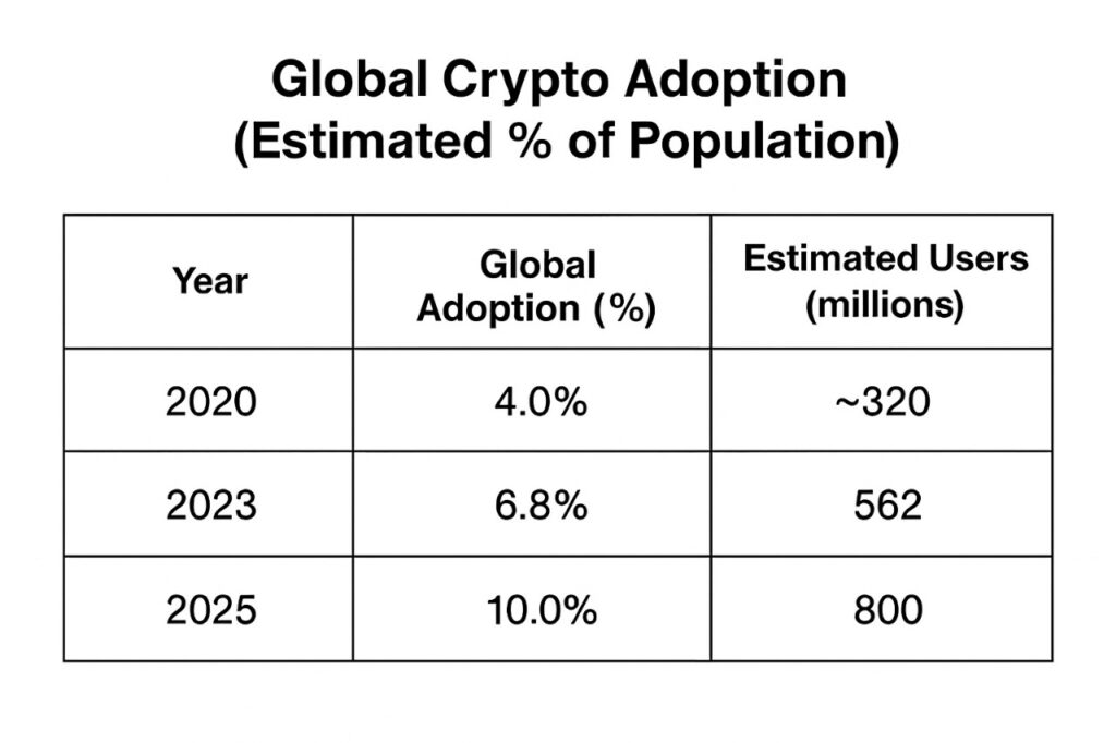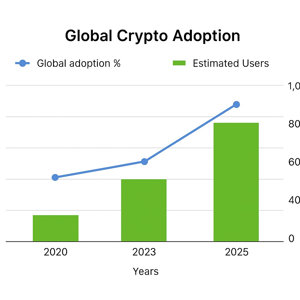 Over the past decade—and especially the past 5 years—cryptocurrency has evolved from an obscure niche into a mainstream financial infrastructure layer. While exact numbers vary, multiple reports indicate hundreds of millions of users worldwide now hold or transact crypto. One source projects that the global crypto user population may approach one billion by 2027. This growth is driven not purely by speculation, but by utility: crypto is being used for payments, remittances, savings, virtual cards, merchant integrations, and as an on-ramp for the unbanked.